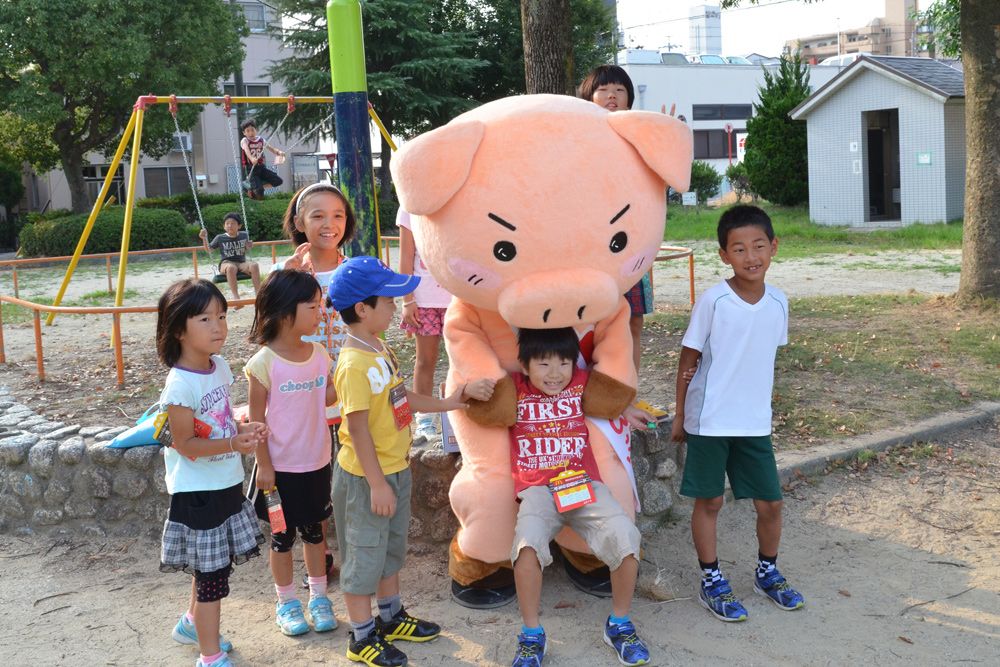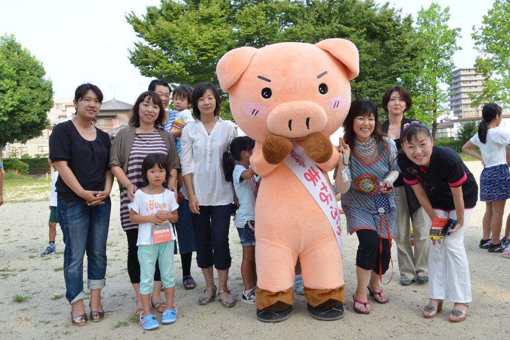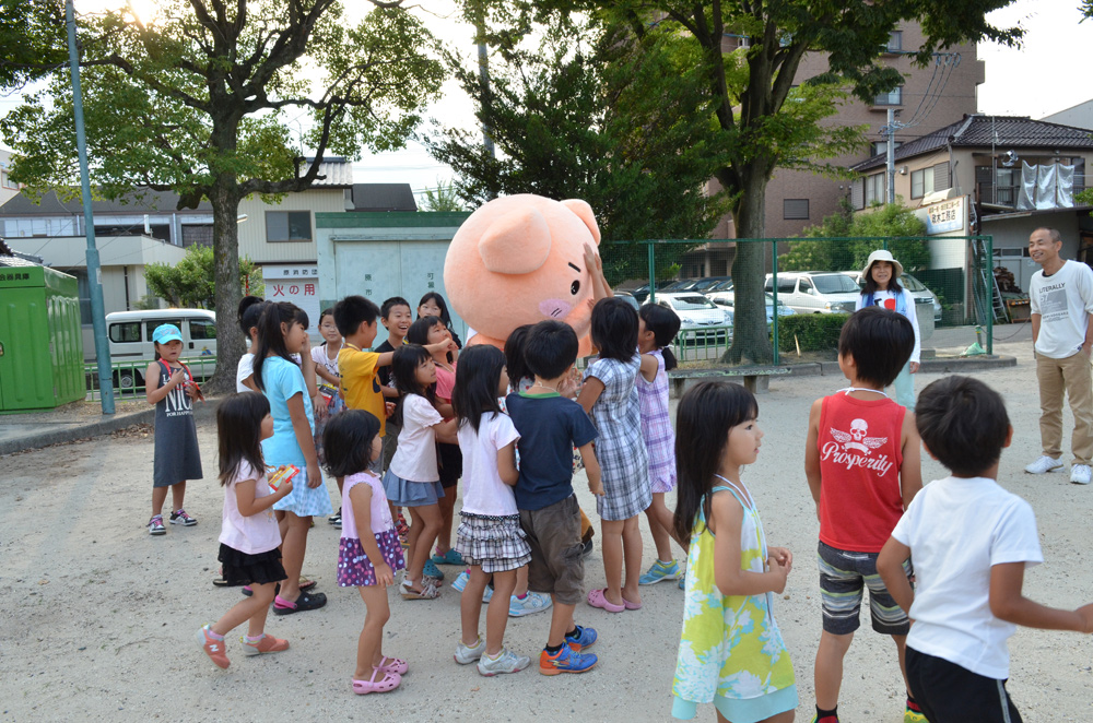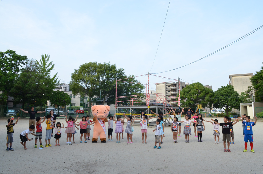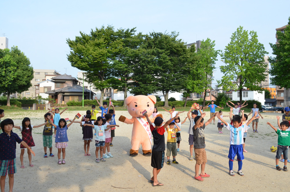 今日7月24日、まなぶぅラジオ体操応援団は上原公園と城下公園にお邪魔しました。まなぶぅの周りにはたくさんの子供たちが集まって大人気、ラジオ体操のスタートを遅らせてしまいました。まなぶぅも猛暑のなか2会場を掛け持ちで巡回して熱中症寸前です。でも、子供たちの喜ぶ顔を見るとがんばらなくっちゃ!!