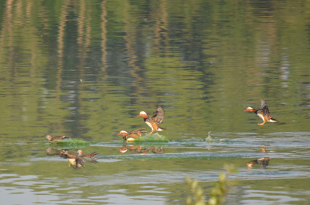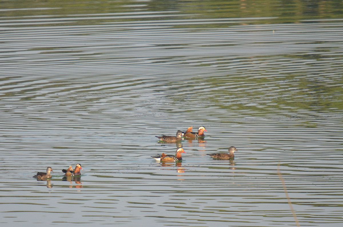オシドリは警戒心が強く、肉眼では見えないほど遠くで泳いでいます。
