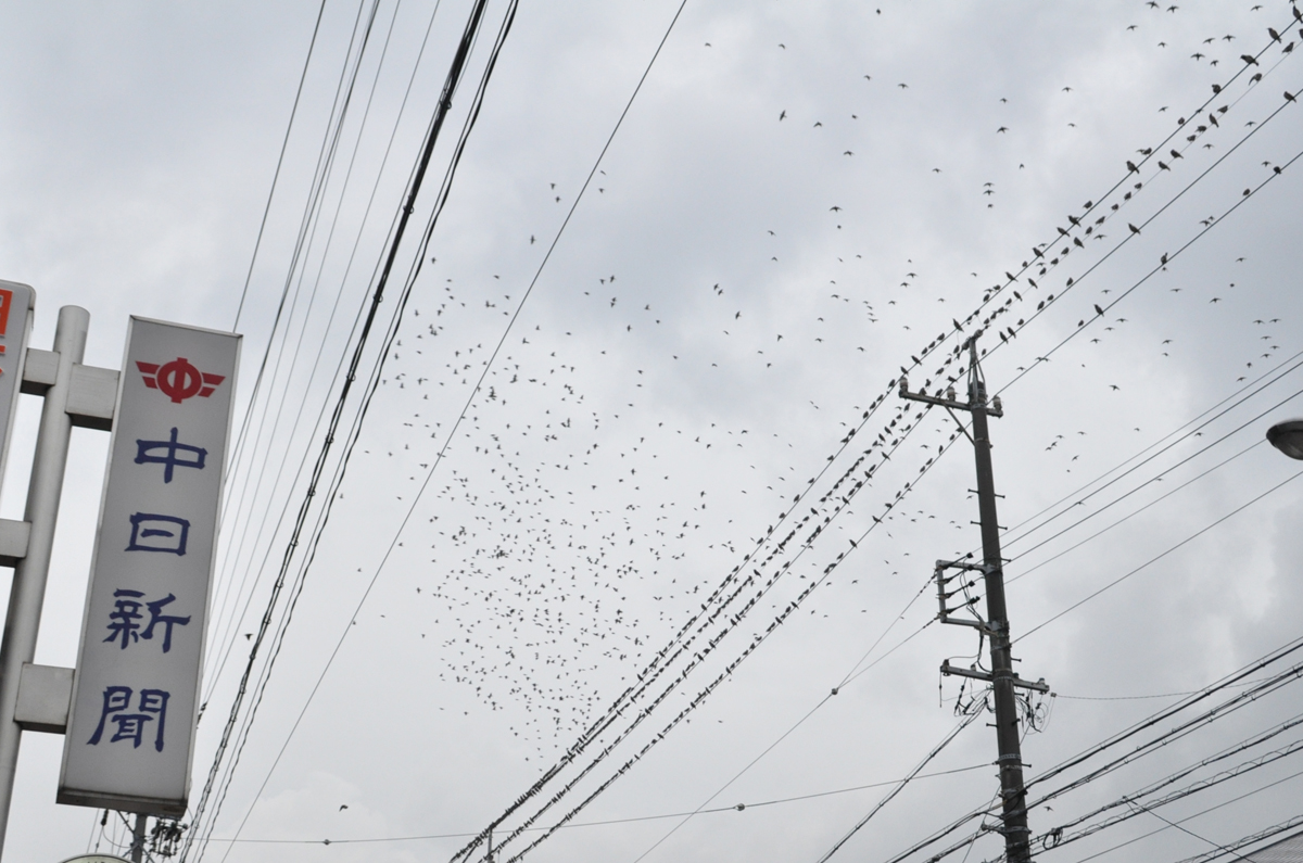 平針4丁目当店の前から一斉にねぐらに向かうムクドリ